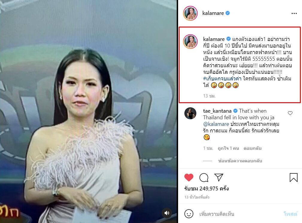 พร้อมข้อความว่า “แกงตัวเองแล้ว1 อย่าถามว่ากี่ปี ต้องมี 10 ปีขึ้นไป มีคนส่งมาบอกอยู่ในหนัง แล้วนี่เหมือนโดนถาดฟาดหน้า!!! บานเป็นจานเชิง! จมูกไร้มิติ ตอนนั้นคิดว่าสวยแล้วนะ เฮ้ยยย! แล้วท่าเต้นตอบจบคืออัลไล กรูต้องเป็นบ้าแน่นอน! เก็บตกจบแล้วค่า ใครทันแสดงตัว ซ้ำเติมได้”
