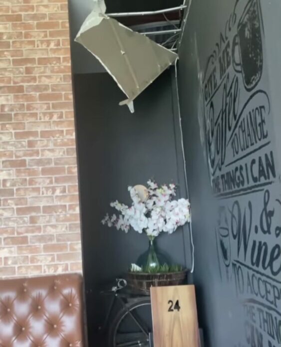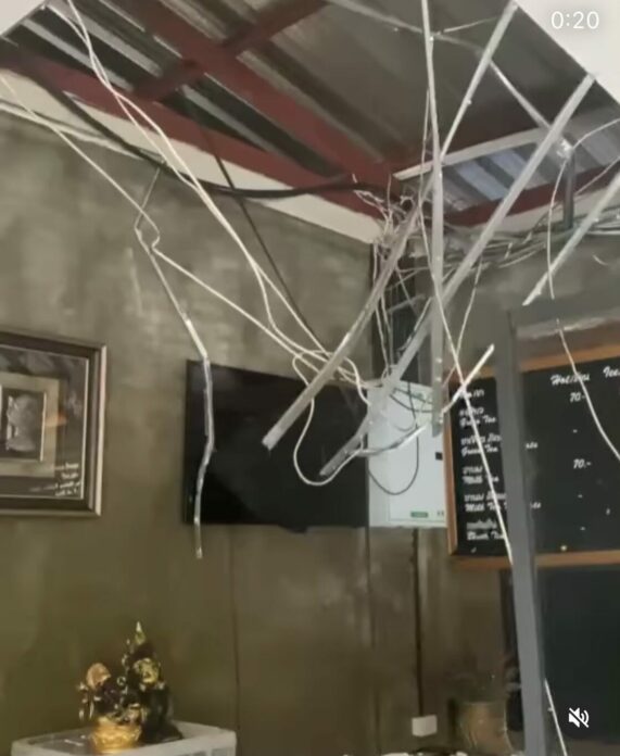 เสียหายหนักขนาดไหน? “ความเสียหายเท่าที่ผมฟังจากการบอกเล่ามาอีกทีหนึ่ง คือเขาพังฝ้าลงมาครับ ประมาณ 10 เปอร์เซ็นต์ที่เป็นรูขนาดนั้น และยังมีอีก 2 จุด ที่เขาพยายามจะลงมาให้ได้ แต่เขาลงมาไม่ได้ รื้อร้านเละไปหมดเลยครับ