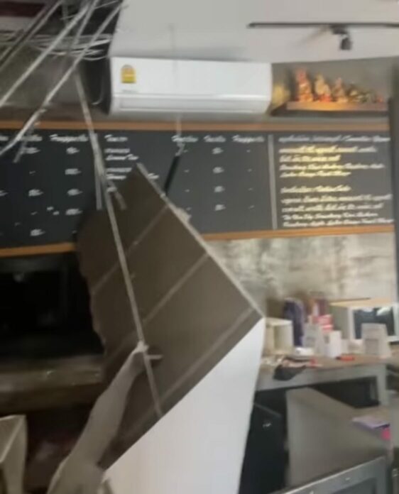 ถอดทีวีออกไป 2 เครื่อง แล้วก็เอาเครื่องบดกาแฟอย่างดีเลยไป 1 เครื่อง มีพระที่เราเอาไว้บูชาในร้านประมาณ 2 องค์ แล้วก็มีข้าวของเครื่องใช้จิปาถะในครัวไปอีกเยอะเลยครับ แต่ข้าวของเราก็ไม่ซีเรียสเท่ากับฝ้าที่มันพัง เพราะมันเป็นโครงสร้าง มันค่อนข้างที่จะหนักอยู่”