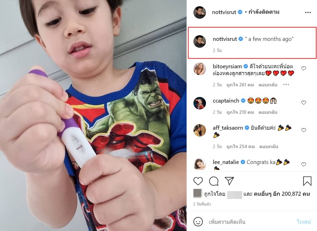 ในขณะที่คุณพ่อ “น็อต วิศรุต” สามีสุดหล่อของคุณแม่ซุปตาร์ “ชมพู่ อารยา เอ.ฮาร์เก็ต” เห่อไม่เบา โพสต์ภาพลูกฝาแฝดคนพี่ “น้องสายฟ้า” กำลังถือที่ตรวครรภ์ที่ขึ้น2ขีด ซึ่งมีความหมายว่า “ท้อง” พร้อมข้อความว่า “a few months ago” แปลว่า “สองสามเดือนก่อน”