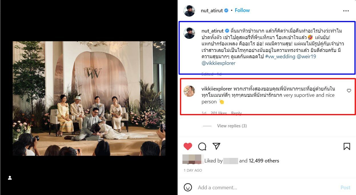 ด้าน “วิกกี้” เจ้าสาวของพระเอกหนุ่ม “เวียร์ ศุกลวัฒน์” เข้ามาคอเมนต์ขอบคุณ “นัท อติรุจ” กลางไอจีว่า “พวกเราทั้งสองขอบคุณพี่นัทมากๆนะที่อยู่ด้วยกันในทุกโมเมนท์ดีๆ ทุกๆคนชมพี่นัทน่ารักมาก very suportive and nice person”