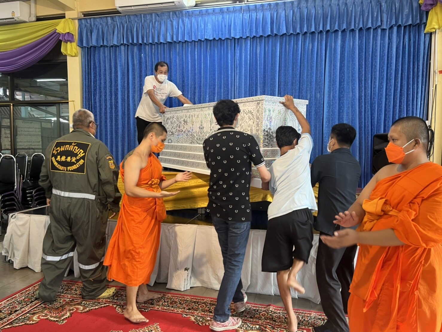 หลังเสร็จสิ้นพิธีรดน้ำศพ เจ้าหน้าที่บรรจุร่าง ซันนี่ ยูโฟร์ ลงสู่โลง ก่อนจะย้ายไปยังศาลาหน้าเมรุซึ่งมีพื้นที่กว้างขวางกว่า เพื่อทำพิธีสวดพระอภิธรรมในช่วงเวลา 18.30 น.ต่อไป
