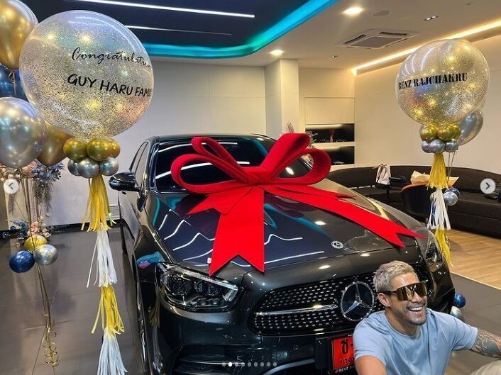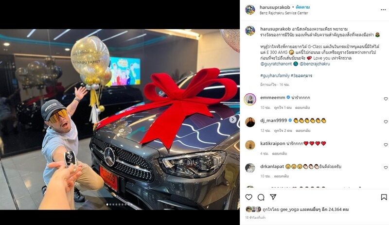 ฮารุ ภรรยา กาย รัชชานนท์ โพสต์โมเมนต์สุดยินดีควงสามีไปถอยรถเบนซ์หรูป้ายแดง E 300 AMG พร้อมแคปชั่นสุดปลื้มใจถึง กาย สามีด้วยว่า อานิสงส์ของความเพียร พยายาม รางวัลของการมีวินัย มองเห็นลำดับความสำคัญของสิ่งที่จะลงมือทำ