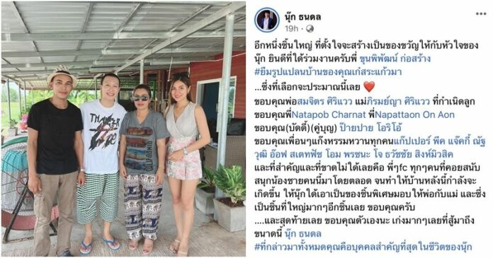“ขอบคุณเพื่อนๆ แก๊งหรรมหวานทุกคน แก๊ปเปอร์ พีค แจ๊คกี้ ณัฐวุฒิ อ๊อฟ สเตทฟัช โอม พรชนะ โจ ธวัชชัย สิงห์มิวสิค และที่สำคัญและที่ขาดไม่ได้เลยคือ พี่ๆ fc ทุกๆ คนที่คอยสนับสนุกน้องชายคนนี้มาโดยตลอด จนทำให้บ้านหลังนี้กำลังจะเกิดขึ้น ให้นุ๊กได้เอาเป็นของชิ้นพิเศษมอบให้พ่อกับแม่ และซึ่งเป็นชิ้นที่ใหญ่มากๆ อีกชิ้นเลย ขอบคุณครับ …และสุดท้ายเลย ขอบคุณตัวเองนะ เก่งมากๆ เลยที่สู้มาถึงขนาดนี้ นุ๊ก ธนดล #ที่กล่าวมาทั้งหมดคุณคือบุคคลสำคัญที่สุดในชีวิตของนุ๊ก”