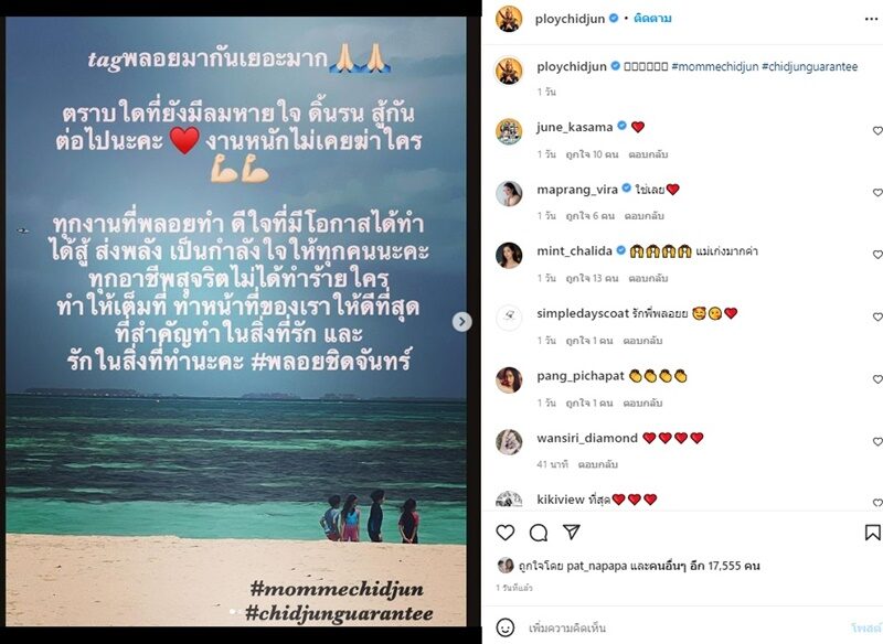 ขณะที่ พลอย ชิดจันทร์ ก็ได้แชร์โพสต์ดังกล่าว พร้อมเขียนข้อความด้วยว่า “tag พลอยกันมาเยอะมาก ตราบใดที่ยังมีลมหายใจ ดิ้นรน สู้กันต่อไปนะคะ งานไม่หนักเคยฆ่าใคร ทุกงานที่พลอยทำ ดีใจที่มีโอกาสได้ทำ ได้สู้ ส่งพลังเป็นกำลังใจให้ทุกคนนะคะ ทุกอาชีพสุจริตไม่ได้ทำร้ายใคร ทำให้เต็มที่ ทำหน้าที่ของเราให้ดีที่สุด ที่สำคัญทำในสิ่งที่รัก และรักในสิ่งที่ทำนะคะ”