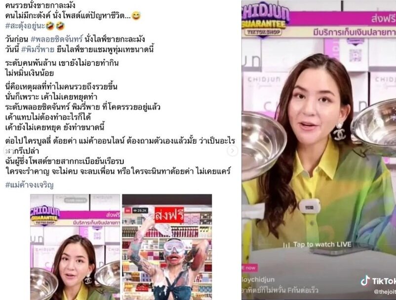 พิมรี่พายไลฟ์ขายแชมพูทุ่มเทขนาดนี้ พลอยชิดจันทร์ นั่งไลฟ์ขายกะละมัง ระดับคนพันล้าน เขายังไม่อายทำกิน พลอย ชิดจันทร์ อ่านแล้วน้ำตามา ลั่นสู้ๆต่อไป หลังเจอด้อยค่าไลฟ์ขายกะละมัง