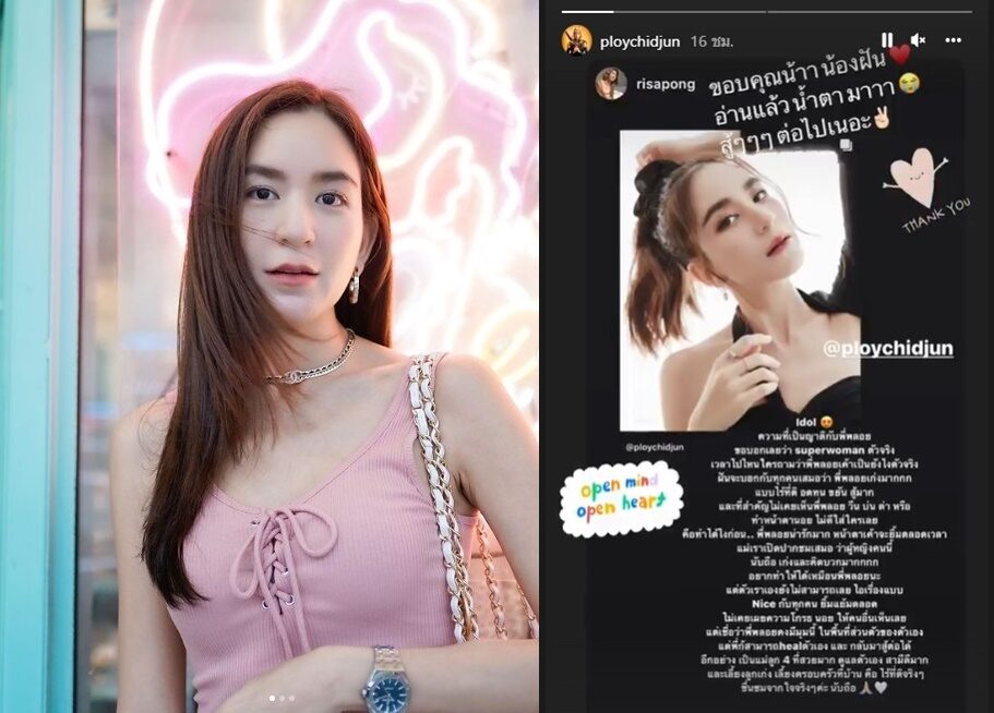 สาว พลอย ชิดจันทร์ ยังรีโพสต์ข้อความจากสาวที่เป็นญาติที่ชื่นชมเจ้าตัว พร้อมบอกตอนหนึ่งว่า อยากทำให้ได้แบบพลอยบ้าง nice กับทุกคน ยิ้มแย้มตลอด ไม่เคยเผยความโกรธ นอย ให้คนอื่นได้เห็นเลย แต่เชื่อว่าพี่พลอยคงมีมุมนี้ ในพื้นที่ส่วนตัวของตัวเอง แต่พี่ก็สามารถ heal ตัวเอง และกลับมาสู้ต่อได้ อีกอย่างเป็นแม่ลูก4ที่สวยมาก ดูแลตัวเอง สามีดีมาก และเลี้ยงลูกเก่ง เลี้ยงครอบครัวที่บ้าน คือ ไร้ที่ติจริงๆ ชื่นชมจากใจจริงๆ นับถือ พร้อมข้อความตอบกลับด้วยว่า ขอบคุณน้าา น้องฝัน อ่านแล้วน้ำตามาาา สู้ๆๆๆ ต่อไปเนอะ