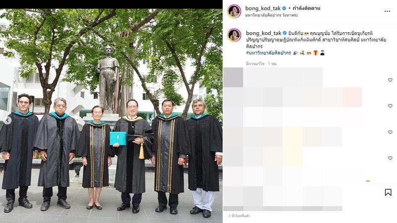 โดย สาวตั๊ก โพสต์ภาพสามีกับใบปริญญา พร้อมระบุข้อความว่า “ยินดีกับ🎊คุณบุญชัย ได้รับการเชิดชูเกียรติ ปริญญาปรัชญาดุษฎีบัณฑิตกิตติมศักดิ์ สาขาวิชาทัศนศิลป์ มหาวิทยาลัยศิลปากร #มหาวิทยาลัยศิลปากร 🎉💐🎊🎁👨🏻🎓”