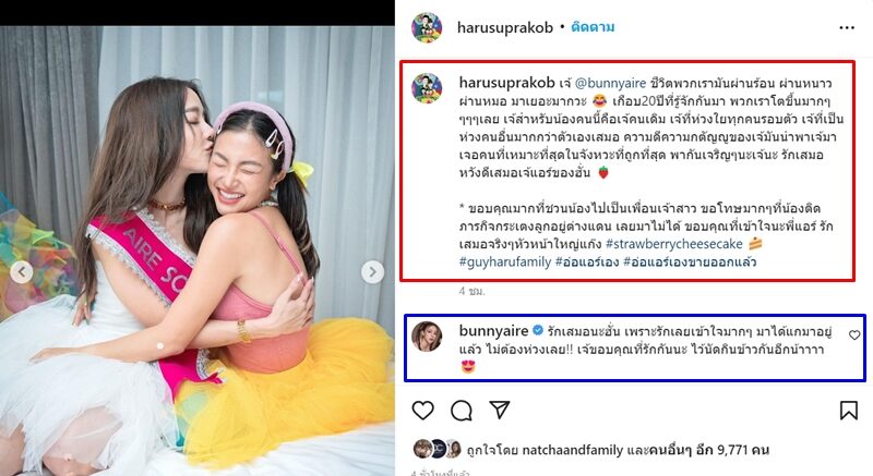 โดย ฮารุ โพสต์ภาพในอดีต พร้อมเขียนข้อความจากหัวใจว่า “เจ้ @bunnyaire ชีวิตพวกเรามันผ่านร้อน ผ่านหนาว ผ่านหมอ มาเยอะมากว่ะ 😂 เกือบ 20 ปีที่รู้จักกันมา พวกเราโตขึ้นมากๆๆๆๆ เลย เจ้สำหรับน้องคนนี้คือเจ้คนเดิม เจ้ที่ห่วงใยทุกคนรอบตัว เจ้ที่เป็นห่วงคนอื่นมากกว่าตัวเองเสมอ ความดีความกตัญญูของเจ้มันนำพาเจ้มาเจอคนที่เหมาะที่สุดในจังหวะที่ถูกที่สุด พากันเจริญๆ นะเจ้นะ รักเสมอ หวังดีเสมอเจ้แอร์ของฮั่น 🍓”