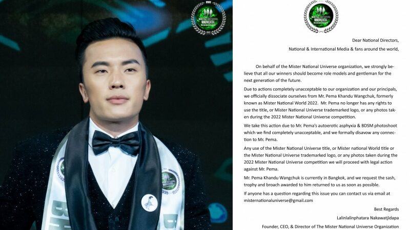 กองประกวด Mister National Universe ประกาศแถลงการณ์ผ่านเฟซบุ๊ก กรณีปลดเพมา กานธู วังชุก (Mr. Pema Khandu Wangchuk) นักแสดงและนายแบบชาวภูฏาณ เจ้าของตำแหน่ง Mister National World 2022 หรือรองอันดับ 1 มิสเตอร์เนชั่นแนล 2022 เหตุมีการถ่ายภาพเชิงเพศแนวอีโรติค และ BDSM ที่ไม่เหมาะสม พร้อมด้วยคลิปวาบหวิวใน OnlyFans ถูกแชร์ต่อว่อนอินเทอร์เน็ต