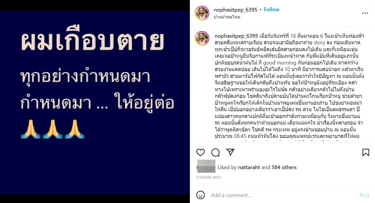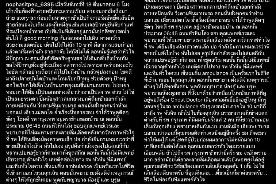 พร้อมเล่าถึงนาทีชีวิตที่เกิดอาการหัวใจวายเฉียบพลันว่า “เมื่อวันจันทร์ที่ 18 ตื่นมาตอน 6 โมงเช้าเห็นท้องฟ้าสวยคลื่นทะเลราบเรียบ สวยจนเอามือถือมาถ่าย story ลง ก่อนเดินหาดทุกเช้าเป็ปก็จะวอร์มอัพยืดเส้นยืดสายก่อนลงไปเดิน และก็เหมือนเช่นเคยเจอป้าหนูยืนจิบกาแฟที่ระเบียงหน้าหาด กับพี่แป๋มที่เดินอยู่แถวนั้นปกติชอบรดน้ำต้นไม้ ก็ good morning กันก่อนออกไปเดิน