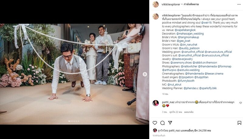 คู่สามีภรรยาป้ายแดงข้าวใหม่ปลามันหมาดๆ เวียร์ ศุกลวัฒน์ และ วิกกี้ ที่ยังคงประทับใจกับภาพความทรงจำในงานวิวาห์ โดยเมื่อวันที่ 20 ก.ค. 65 วิกกี้ ภรรยา ได้เผยโมเมนต์ความน่ารักของสามีในวันแต่งงาน พร้อมแคปชั่นสุดประทับใจในตัวสามีว่า