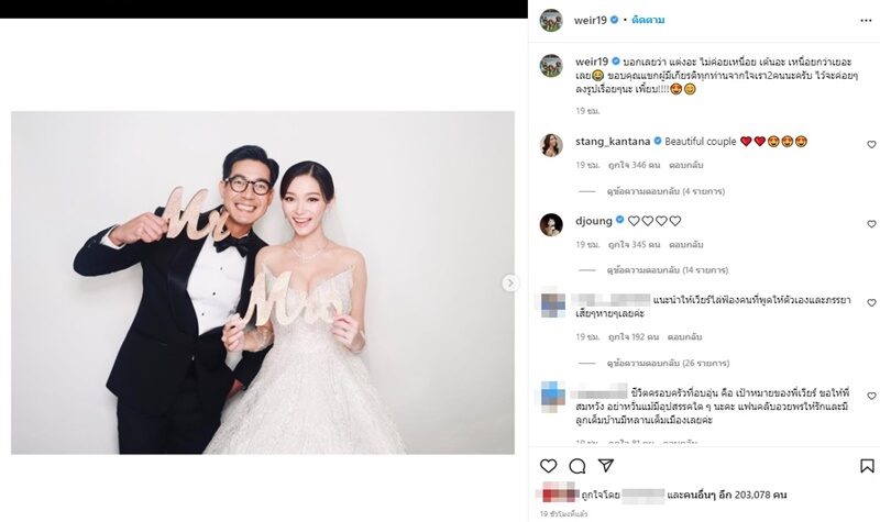 ด้าน เวียร์ สามี ก็โพสต์เช่นกันภาพหวานกับภรรยาในงานแต่ง พร้อมแคปชั่นติดตลกด้วยว่า บอกเลยว่า แต่งอะ ไม่ค่อยเหนื่อย เต้นอะ เหนื่อยกว่าเยอะเลย ขอบคุณแขกผู้มีเกียรติทุกท่านจากใจเรา2คนนะครับ ไว้จะค่อยๆลงรูปเรื่อยๆนะ เพี้ยบ!!!!