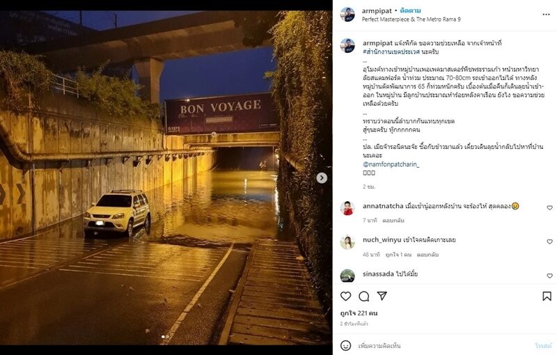 อีกหนึ่งผู้ประสบความเดือดร้อนจากพิษฝนถล่มน้ำท่วมหนัก อาร์ม พิพัฒน์ โพสต์ภาพและคลิปพร้อมแจ้งเหตุว่า แจ้งพิกัด ขอความช่วยเหลือ จากเจ้าหน้าที่ #สำนักงานเขตประเวศ นะครับ …อุโมงค์ทางเข้าหมู่บ้านเพอเพคมาสเตอร์พีชพระรามเก้า หน้ามหาวิทยาลัยสแตมฟอร์ด น้ำท่วม ประมาณ 70-80cm รถเข้าออกไม่ได้ ทางหลังหมู่บ้านตัดพัฒนาการ 65 ก็ท่วมหนักครับ