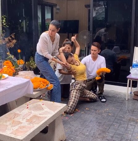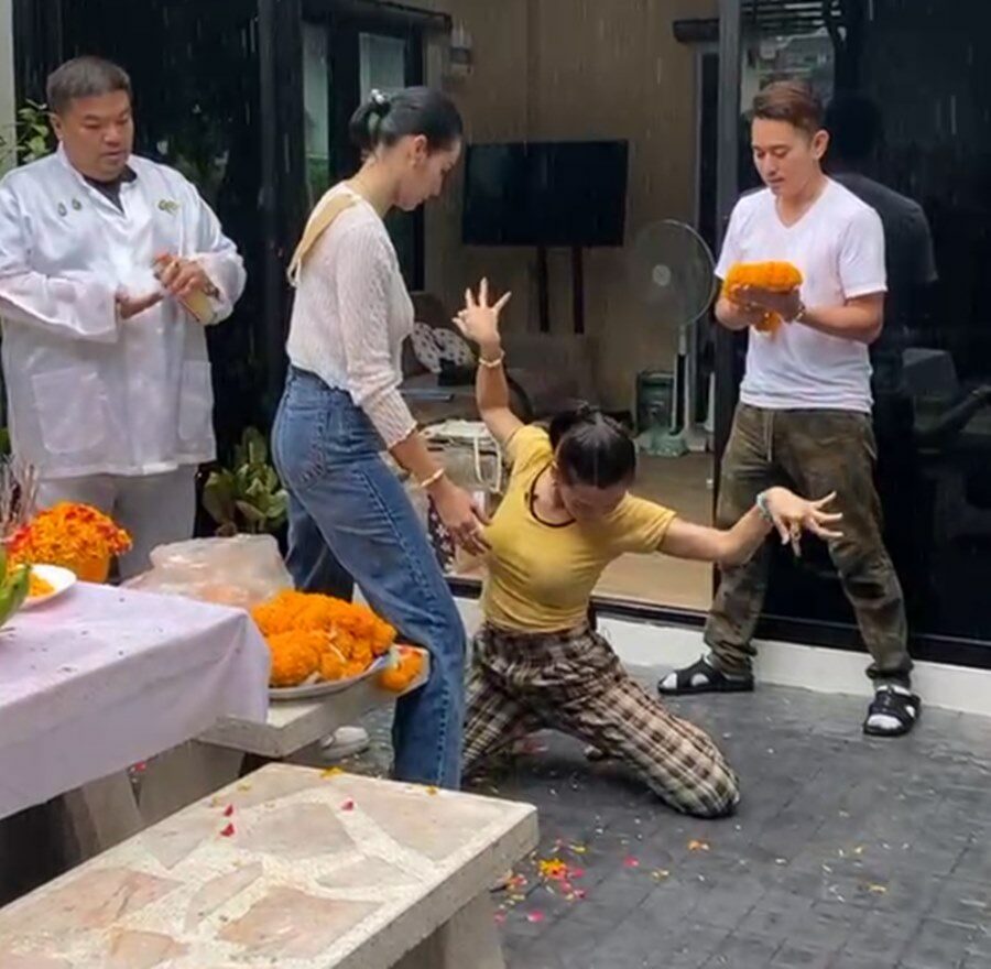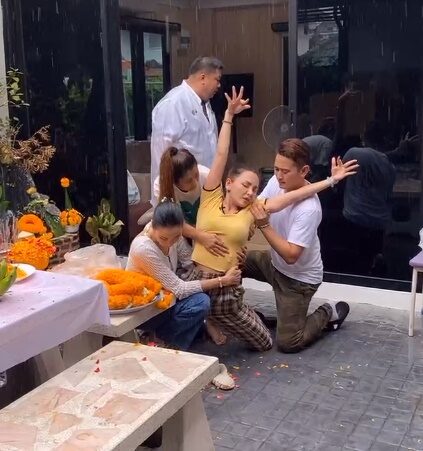 แต่จังหวะไหว้อยู่นั้น จู่ๆ แคนดี้ รากแก่น เริ่มมีอาการตัวสั่นๆ และหลับตา ร่วงลงไปกองกับพื้น โดยมีดาราสาว ษา วรรณษา ทองวิเศษ คอยประคองตัวอยู่ใกล้ๆ จากนั้นแคนดี้ลงไปรำเลื้อยท่าทางคล้ายงูและพญานาค