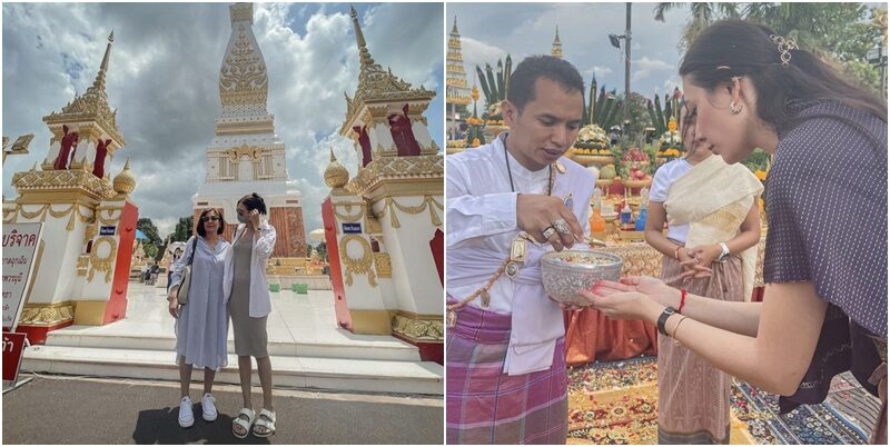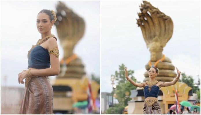 ถามถึงเรื่องที่ไปรำบวงสรวงพญาศรีสัตตนาคราช? “เริ่มจากการที่เราก็จัดทริปไปทำบุญเฉยๆ แล้วก็จับพลัดจับผลูยังไงไม่รู้ว่าตัวเองต้องไปรำด้วย แล้วก็อีกวันนึงมีการเช็กคิวกันว่าวันที่ 7 เดือน 7 จะมีงานบวงสรวงใหญ่ประจำปีของจังหวัด พอเช็กแล้วก็ขนลุกคือทุกอย่างมันลงล็อกและจังหวะมันได้หมดก็เลยสรุปว่าเป็นเรา ดีใจมาก แล้ววันจริงก็คือฝนตกหนักมาก ข้างนอกมองอะไรไม่เห็นเลย เราก็ยังคิดอยู่ว่าจะได้รำไหม แต่พอเริ่มพิธีฝนก็เบาลงๆ จนรำเสร็จกลายเป็นรุ้งกินน้ำขึ้นสวยมาก เส้นชัดทุกอย่างชัดไปหมดเลย”