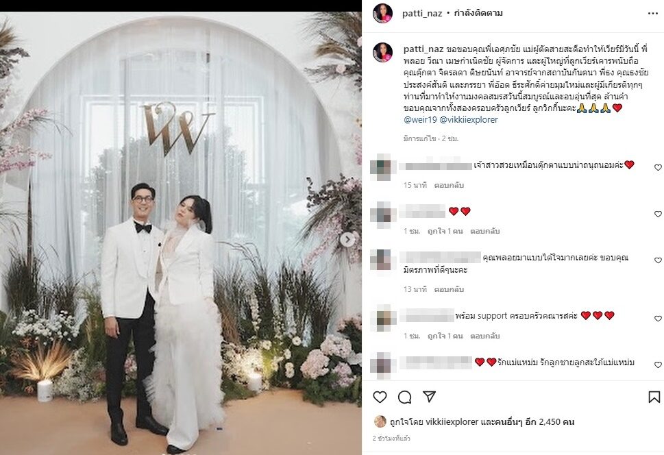 ความประทับใจในงานแต่ง เวียร์ ศุกลวัฒน์ และ วิกกี้ ภรรยา ยังตราตรึงในความทรงจำของครอบครัวและแฟนคลับ คุณแม่แหม่ม พลอยไพลิน คุณแม่ของหนุ่มเวียร์ ล่าสุดวันที่ 22 ก.ค.65 ได้ออกมาเผยโมเมนต์ซาบซึ้งโพสต์ขอบคุณ เอ ศุภชัย ผู้ชักนำเข้าวงการ พลอย วีณา ผู้จัดการ และผู้ใหญ่ในวงการบันเทิงที่มาร่วมในงานวิวาห์ลูกชาย พร้อมแคปชั่นว่า