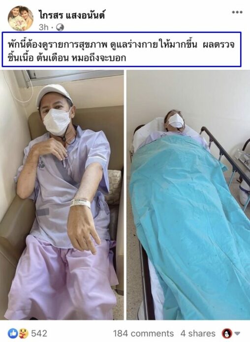 พร้อมกันนี้ ไกรสร ยังได้เขียนข้อความกำกับว่า “พักนี้ต้องดูรายการสุขภาพ ดูแลร่างกายให้มากขึ้น ผลตรวจชิ้นเนื้อ ต้นเดือน หมอถึงจะบอก” ท่ามกลางแฟนๆ ที่เข้ามาส่งกำลังใจอย่างท่วมท้น