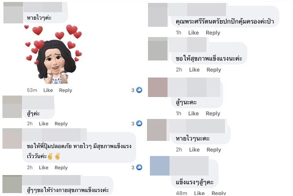 อาทิ ขอให้พี่ปุ้มปลอดภัย หายไวไว มีสุขภาพที่แข็งแรงเร็ววันค่ะ, ขอให้ดีวันดีคืน, คุณพระศรีรัตนตรัยปกปักคุ้มครองค่ะป๊า, สู้ๆ ขอให้ร่างกายสุขภาพแข็งแรงค่ะ, เป็นห่วงนะคะ, ขอให้พี่ชายที่น่ารักพ้นภัยอันตรายใดๆ ทั้งปวงนะคะ เป็นต้น