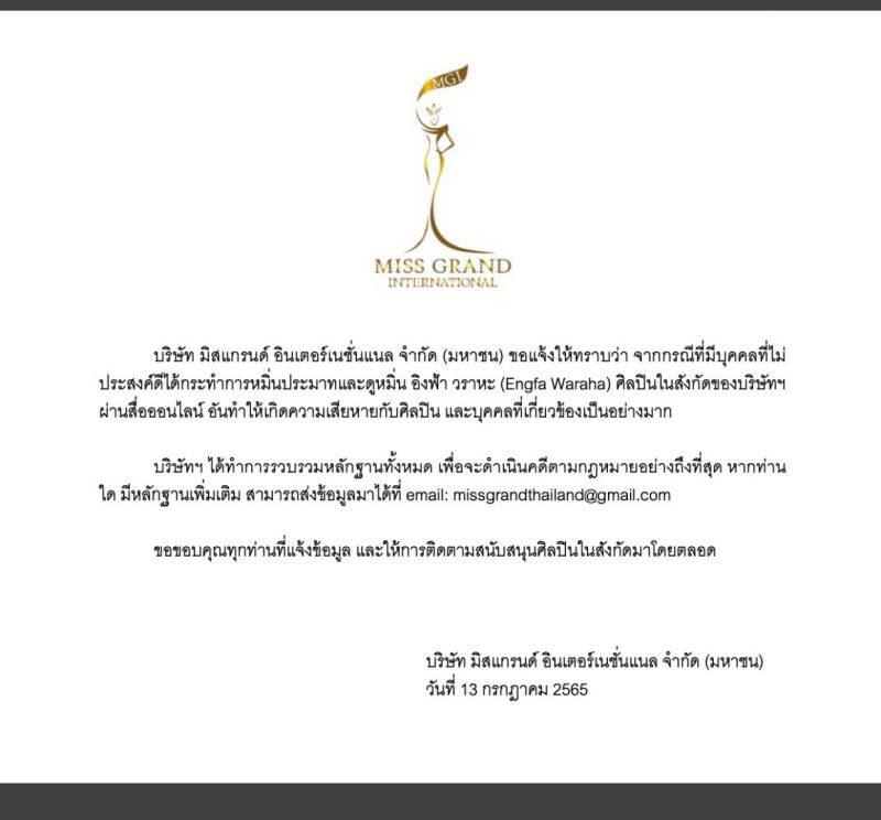 อิงฟ้า ตอบปมกองมิสแกรนด์ / จากกรณีที่สื่อโซเชี่ยลของ มิสแกรนด์ไทยแลนด์ออกประกาศเมื่อ 13 ก.ค.2565 ที่ผ่านมาว่า จะฟ้องคนที่แสดงความเห็น พาดพิงให้ “อิงฟ้า วราหะ” มิสแกรนด์ไทยแลนด์2022 เสียหาย โดยมีข่าวว่าหนึ่งในนั้นคือ ลีน่าจัง