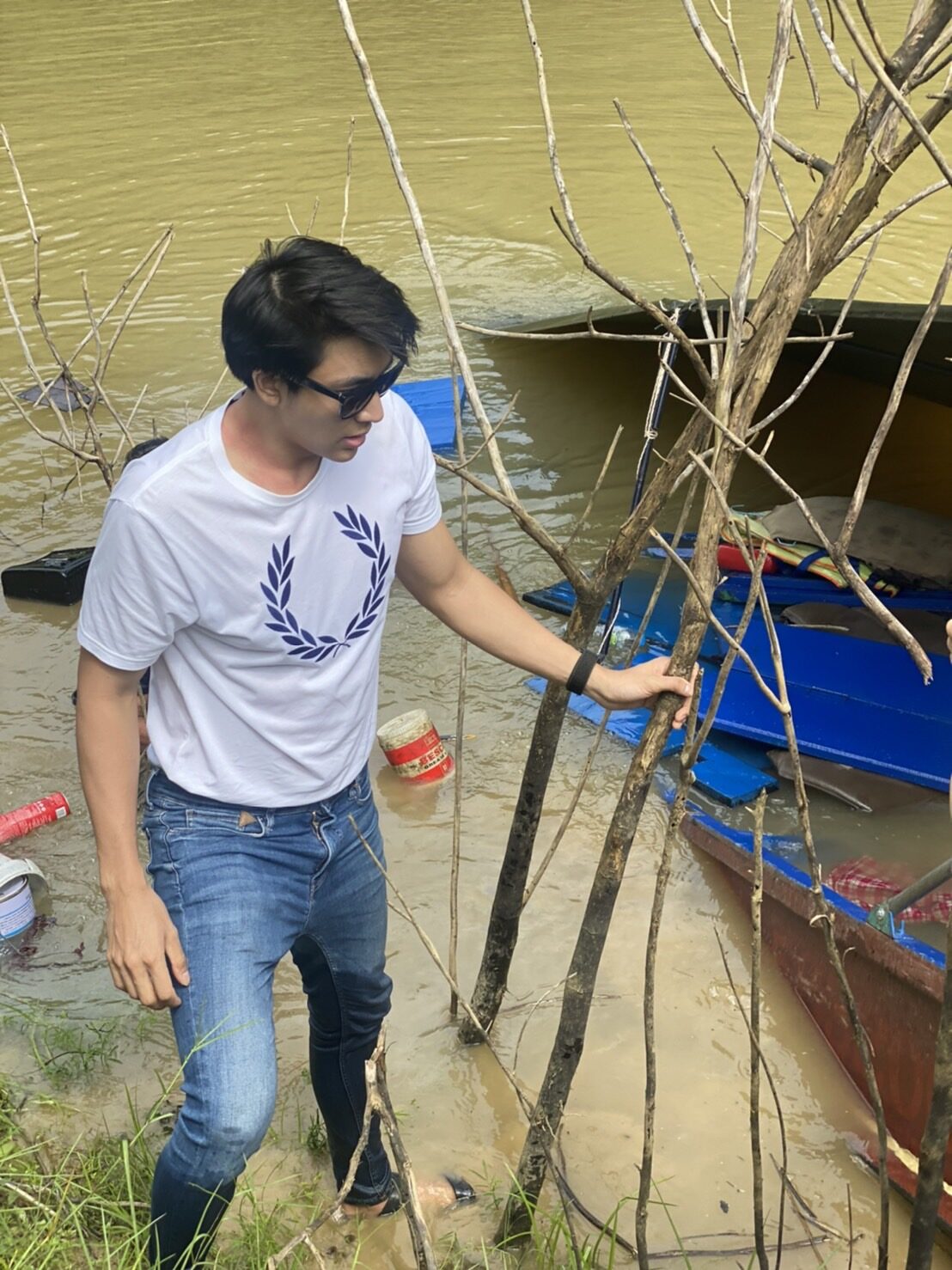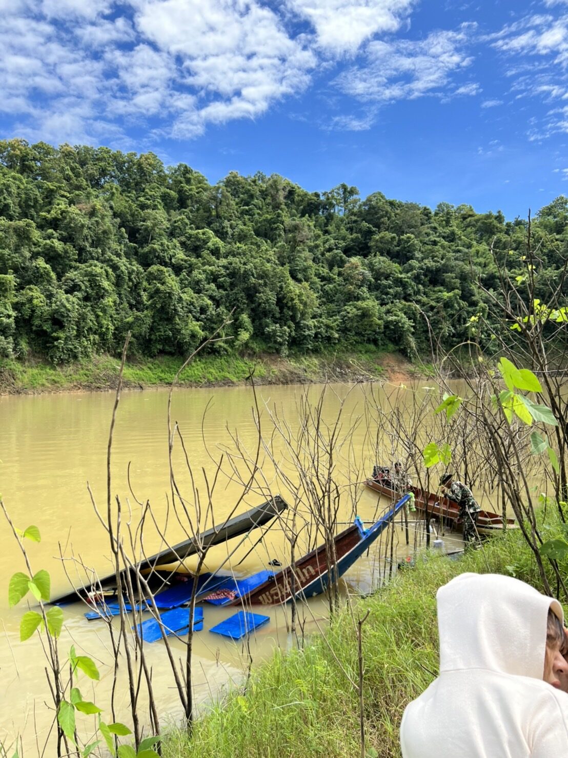 โดย บิ๊ก ณทรรชัย เผยว่า ช่วงที่ตนและเพื่อนมาทำบุญนั้นเป็นช่วงที่พายุฝนเข้า จึงเกิดเหตุการณ์ไม่คาดคิด ขณะนั่งเรือไปเที่ยวขากลับ โดยลุงคนขับเล่าว่าปกติไม่เคยเจอเหตุการณ์เรือชนโขดไม้มาก่อนจากประสบการณ์รับ-ส่งผู้โดยสาร เหตุการณ์แบบนี้เกิดขึ้นเป็นครั้งแรก ซึ่งระหว่างที่เรือชนโขดไม้ น้ำได้ซึมเข้ามาในเรือ ทำให้ลุงคนขับต้องทิ้งเรือ เนื่องจากสภาพเรือพังยับเยิน แล้วช่วยทุกคนขึ้นฝั่ง ท่ามกลางความตกใจของทุกคนบนเรือที่ตกน้ำตัวเปียก ต่างคนต่างช่วยเพื่อนๆ ที่ว่ายน้ำไม่เป็นขึ้นฝั่ง ซึ่งขณะนี้ปลอดภัยกันทุกคน