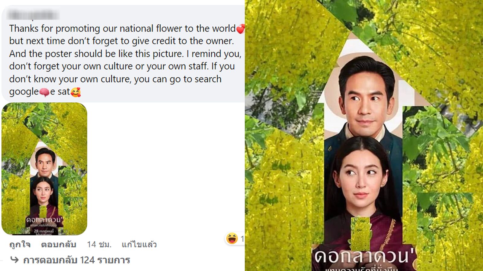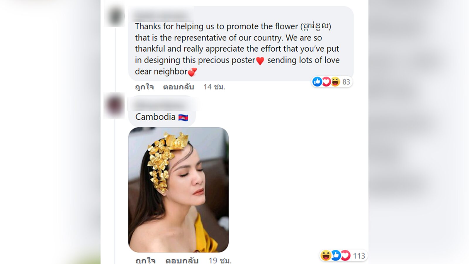 โดยเริ่มจากชาวเน็ตกัมพูชารายหนึ่งได้เข้ามาแสดงความคิดเห็น แปลได้ประมาณว่า “ขอขอบคุณสำหรับการส่งเสริมดอกไม้ประจำชาติของเราให้โลกรู้ แต่ครั้งหน้าอย่าลืมให้เครดิตเจ้าของด้วยนะคะ และโปสเตอร์ควรจะเป็นเหมือนภาพนี้ ขอเตือนว่าอย่าลืมวัฒนธรรมของตนเอง หรือรากเหง้าของตนเอง ถ้ายังไม่รู้ ก็เข้าไปค้นหาบนกูเกิลได้นะ” พร้อมแนบรูปตัดต่อดอกราชพฤกษ์ ซึ่งเป็นดอกไม้ประจำชาติไทย