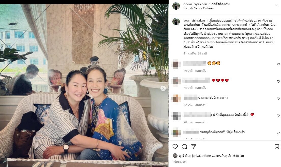 อดีตนางเอกดัง อุ้ม สิริยากร โพสต์ภาพร่วมเฟรม ปิงปอง สะแกวัลย์ เพื่อนสนิทตั้งแต่แสดงสี่แผ่นดินด้วยกัน พร้อมลูกๆ หลังไม่ได้เจอกันนาน พร้อมแคปชั่นน่ารักด้วยว่า เพื่อนช้อยยยยยย!!! ชั้นคิดถึงแม่ช้อยมาก จริงๆ นะ เราสนิทกันมาตั้งแต่สี่แผ่นดิน แต่ต่างคนต่างแยกย้าย ไม่ได้เจอกันมาร่วมสิบปี