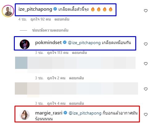 ทำเอาเพื่อนซี้อย่าง ไอซ์ พิชพงศ์ เห็นแล้วทนไม่ไหวเข้ามาบอกว่า “เกลียดเสื้อตัวนี้จุง 🔥🔥” เข้าทาง หนุ่มป๊อก สามีที่คอมเมนต์ต่อทันทีว่า “เกลียดเหมือนกัน” โดย สาวมาร์กี้ ได้ตอบกลับว่า “ก็บอกแล้วอากาศมันร้อนนนนน”