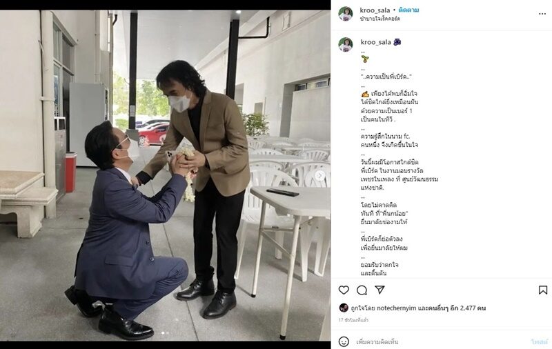 ครูสลา คุณวุฒิ นักร้องนักดนตรีและโปรดิวเซอร์ เผยโมเมนต์ พี่เบิร์ด ธงไชย ย่อตัวยื่นมาลัยให้ จนต้องกลั้นน้ำตาสุดตื้นตันกับความเป็นพี่เบิร์ดว่า “..ความเป็นพี่เบิร์ด..” เพียงได้พบก็อิ่มใจ ได้ชิดใกล้ยิ่งเหมือนฝัน ด้วยความเป็นเบอร์ 1 เป็นคนในทีวี ความรู้สึกในนาม fc. คนหนึ่ง จึงเกิดขึ้นในใจ วันนี้ผมมีโอกาสใกล้ชิด พี่เบิร์ด ในงานมอบรางวัล เพชรในเพลง ที่ ศูนย์วัฒนธรรมแห่งชาติ โดยไม่คาดคิด