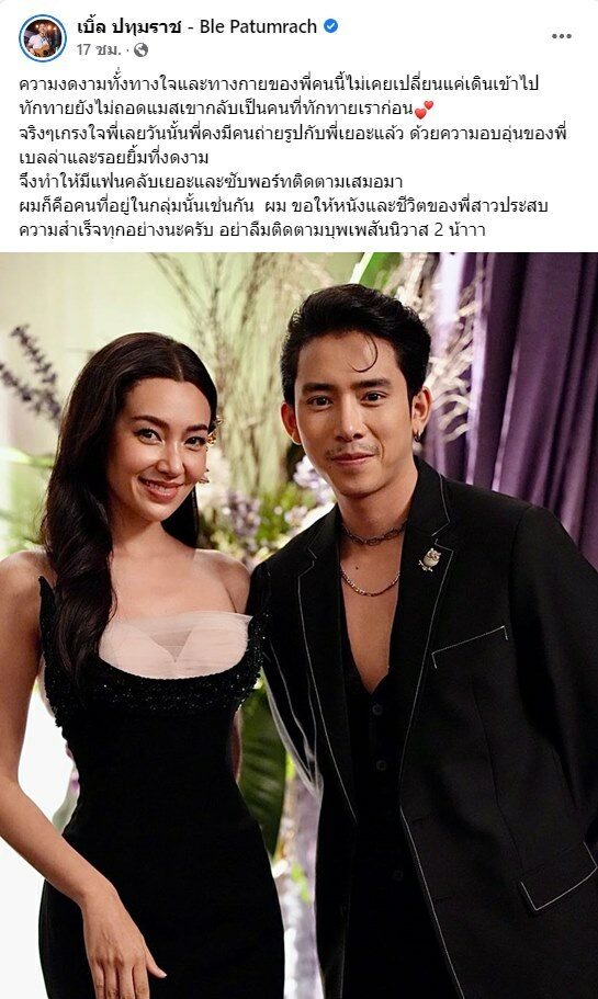 พร้อมเล่าถึงความประทับใจต่อ “เบลล่า” ว่า “ความงดงามทั้งทางใจและทางกายของพี่คนนี้ไม่เคยเปลี่ยน แค่เดินเข้าไปทักทายยังไม่ถอดแมสเขากลับเป็นคนที่ทักทายเราก่อน จริงๆเกรงใจพี่เลยวันนั้น พี่คงมีคนถ่ายรูปกับพี่เยอะแล้ว ด้วยความอบอุ่นของพี่เบลล่าและรอยยิ้มที่งดงามจึงทำให้มีแฟนคลับเยอะและซับพอร์ตติดตามเสมอมา ผมก็คือคนที่อยู่ในกลุ่มนั้นเช่นกัน ผม ขอให้หนังและชีวิตของพี่สาวประสบความสำเร็จทุกอย่างนะครับ อย่าลืมติดตามบุพเพสันนิวาส 2 น้าาา”
