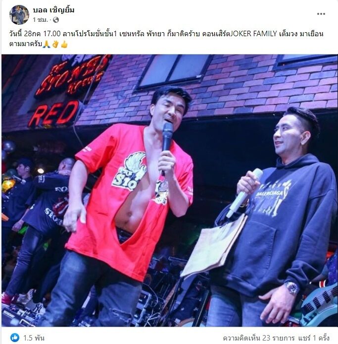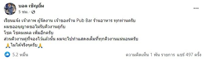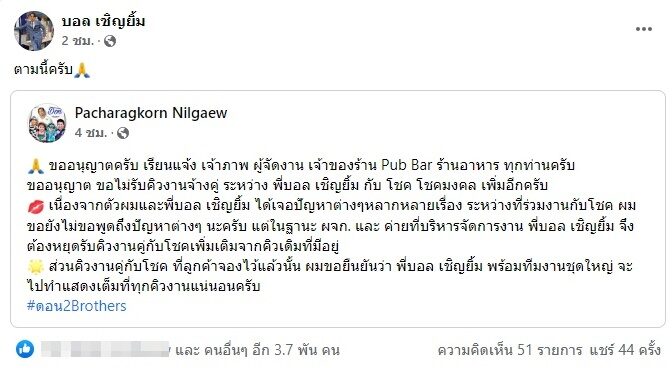 จากนั้น บอล ยังได้แชร์โพสต์ของ ดอน พชรกร นิลแก้ว CEO ค่ายเพลง 2Brothers ที่โพสต์เช่นเดียวกันว่า ขออนุญาตครับ เรียนแจ้ง เจ้าภาพ ผู้จัดงาน เจ้าของร้าน Pub Bar ร้านอาหาร ทุกท่านครับ ขออนุญาต ขอไม่รับคิวงานจ้างคู่ ระหว่าง พี่บอล เชิญยิ้ม กับ โชค โชคมงคล เพิ่มอีกครับ