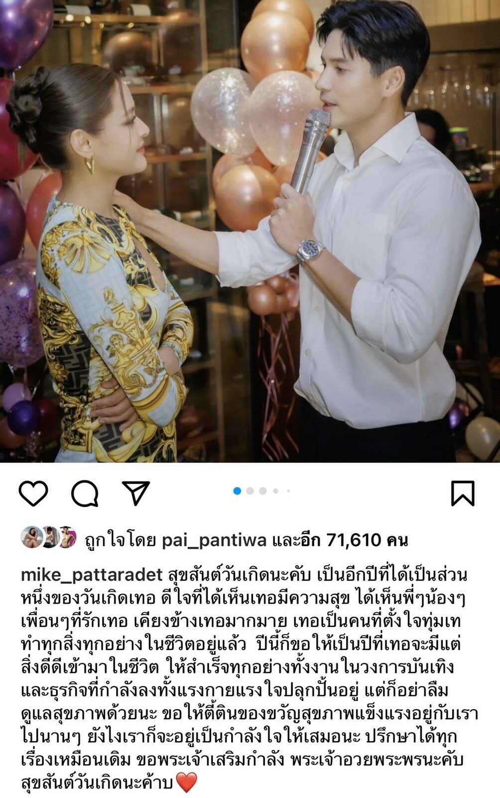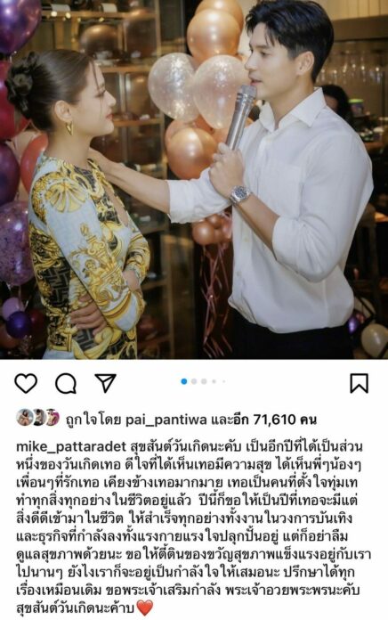 2 ครอบครัวเจอกันในวันเกิด? “ใช่ค่ะ จริงๆ เจอคุณแม่ไมค์มานาน แต่คุณแม่อาจจะไม่ได้ออกในสื่อโซเชียลของทางฝั่งเราสักเท่าไหร่ คือคุณแม่เขาดูแลหนูดีทุกอย่าง คือครอบครัวของคุณไมค์เขาน่ารัก คุณแม่ของไมค์ชวนคุยตลอด ปุ๊กลุกเข้ากับคุณแม่ได้ดี ส่วนคุณพ่อของปุ๊กลุกก็ได้เจอไมค์ ปกติจะเงียบๆ ทั้งคู่ แต่เพราะคุณพ่อเงียบกว่า เลยทำให้ไมค์ต้องเป็นฝ่ายพยายามชวนคุยแทน”