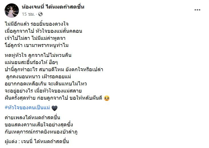 เจนนี่ แต่งเพลง อาลัยต่อเหตุกราดยิงหนองบัวลำภู แต่งไปร้องไห้ไป คนฟังทะลุล้าน