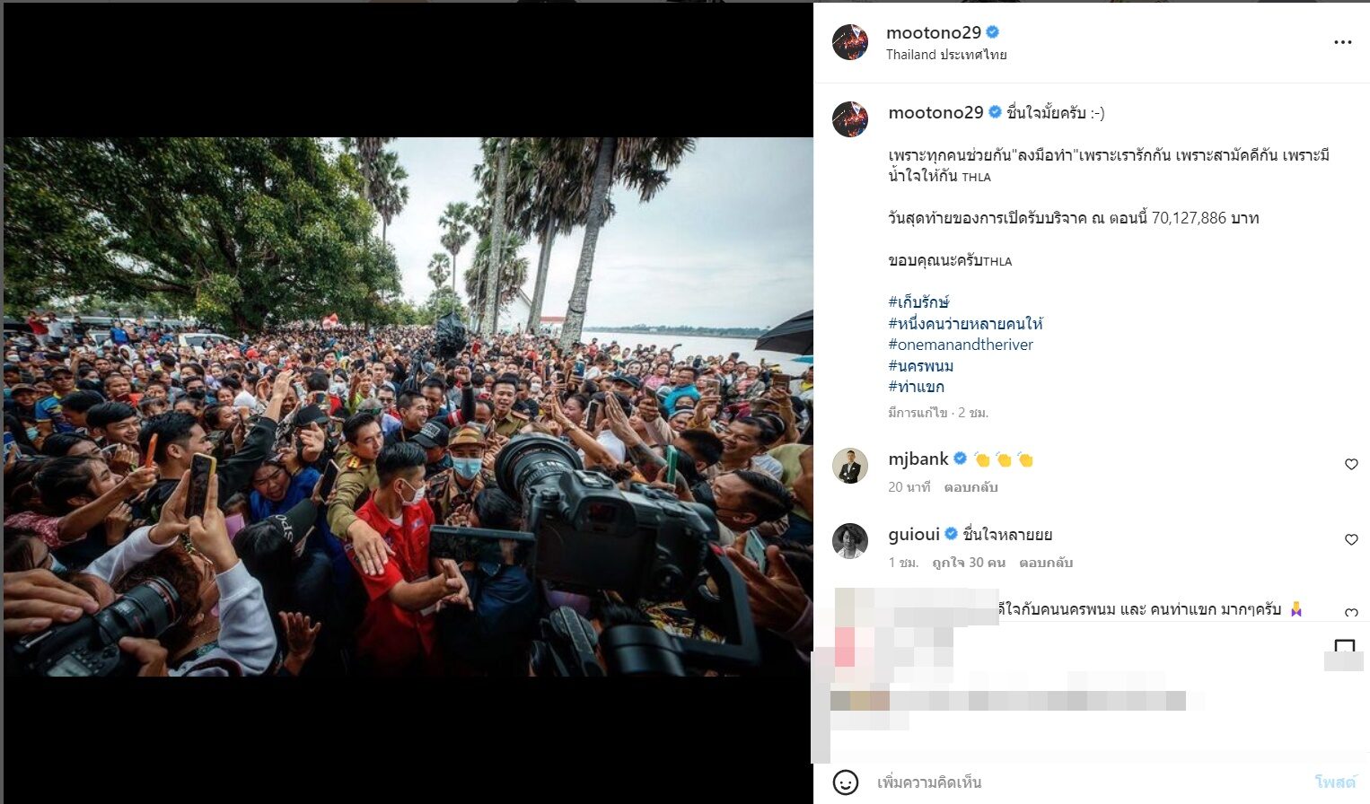 ซึ่งก็มีคนในวงการ อาทิ แบงค์ พชร เข้ามาปรบมือให้ และ อุ๋ย บุดดา เบลส ที่เข้ามาคอมเมนต์ ชื่นใจหลาย และแฟนๆ ที่เข้ามาให้กำลังใจและชื่นชมหนุ่มโตโน่ กับภารกิจที่ประสบความสำเร็จอย่างมาก สำหรับยอดสุทธิของโครงการ “One Man And The River หนึ่งคนว่ายหลายคนให้” ในตอนปิดรับบริจาค จะอยู่ที่เท่าไหร่ ข่าวสดออนไลน์ จะมาอัปเดตอีกครั้ง