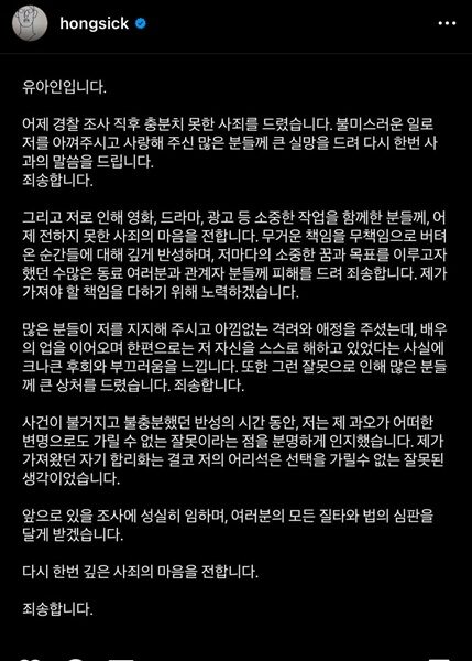ล่าสุด ยู อาอิน ได้ออกมาโพสต์จดหมาย ขอโทษผ่าน instagram “Hongsick“ พร้อมยืนยันไม่สามารถพูดออกมาได้ทั้งหมด โดยระบุใจความว่า…