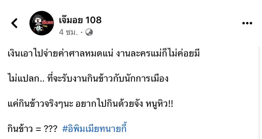 โดยระบุข้อความว่า “เงินเอาไปจ่ายค่าศาลหมดแน่ งานละครแม่ก็ไม่ค่อยมี ไม่แปลก.. ที่จะรับงานกินข้าวกับนักการเมือง แค่กินข้าวจริงๆ นะ อยากไปกินด้วยจัง หนูหิว!! กินข้าว = ??? #อิพิมเมียทนายกี้”