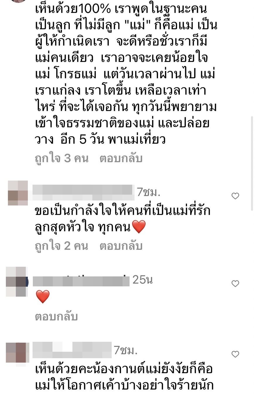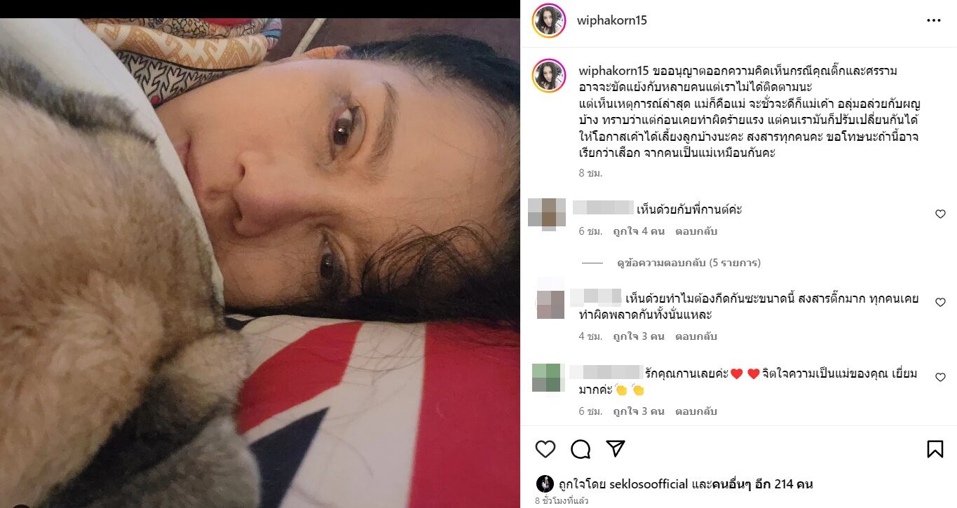 ทั้งนี้ กานต์ วิภากร ภรรยาร็อกเกอร์ชื่อดัง เสก โลโซ ได้โพสต์ข้อความแสดงความคิดเห็นถึงเรื่องดังกล่าว สงสารเห็นใจ ในฐานะหัวอกคนเป็นแม่ โดยระบุว่า