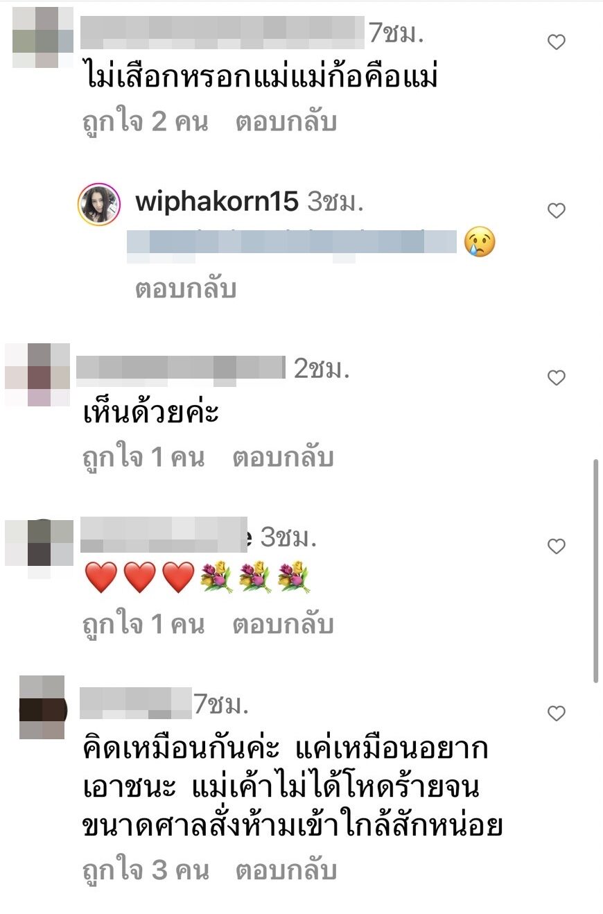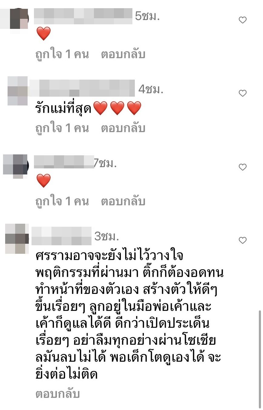 “ขออนุญาตออกความคิดเห็น กรณีคุณติ๊กและศรราม อาจจะขัดแย้งกับหลายคนแต่เราไม่ได้ติดตามนะ แต่เห็นเหตุการณ์ล่าสุด แม่ก็คือแม่ จะชั่วจะดีก็แม่เขา อะลุ่มอล่วยกับผู้หญิงบ้าง ทราบว่าแต่ก่อนเคยทำผิดร้ายแรง แต่คนเรามันก็ปรับเปลี่ยนกันได้ ให้โอกาสเขาได้เลี้ยงลูกบ้างนะคะ สงสารทุกคนค่ะ ขอโทษนะถ้านี้อาจเรียกว่าเสือก จากคนเป็นแม่เหมือนกันค่ะ”