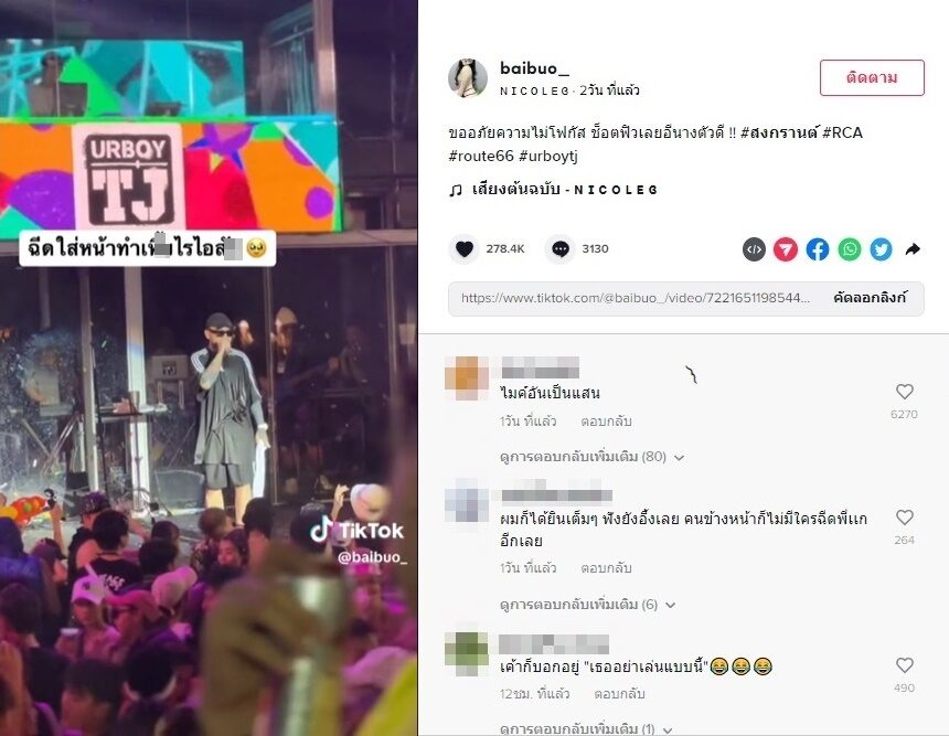 จากกรณีมีผู้ใช้ TikTok รายหนึ่ง โพสต์คลิปเหตุการณ์ พร้อมระบุข้อความเอาไว้ว่า “ขออภัยความไม่โฟกัส ช็อตฟิวเลยอีนางตัวดี !! #สงกรานต์ #RCA #route66 #urboytj” ในคลิปขณะแร็พเปอร์คนดัง UrboyTJ (ยัวร์บอยทีเจ) หรือ เต๋า-จิรายุทธ ผโลประการ ขึ้นร้องเพลงบนเวทีในงานเทศกาลสงกรานต์ แต่กลับโดนคนในงานฉีดน้ำเข้าที่หน้าอย่างจัง จนเจ้าตัวถึงกับฟาดกลับผ่านไมค์ที่กำลังร้องเพลงอยู่ว่า “ฉีดใส่หน้าทำเหี้…ไรไอสั…” ก่อนจะร้องเพลงต่อ