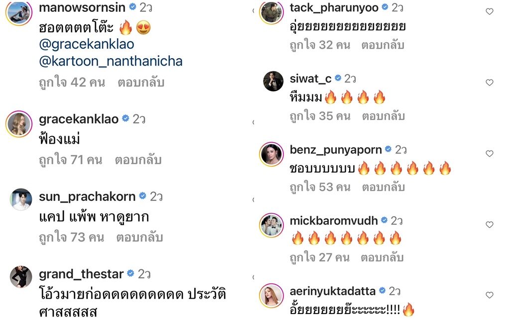 งานนี้ เพื่อนพ้องดาราต่างเข้ามาแซวกันใหญ่ กับภาพหาดูยากของ สาวเชียร์ เซ็ตนี้ อาทิ ฮอตตตโต๊ะ, แคปแพ้พ หาดูยาก, อั้ยยะ!!, ฟ้องแม่, โอ้วมายก่อดดดดดดดดด ประวัติศาสสสสส, อุ้ยยยย, หืมม, อื้อหือหูวววว จังหวะที่รอคอย แซ่บมากค้าบ, หน้าร้อนนี้ เดือดดดดมากกกก ทะเลลุกเป็นไฟ ฯลฯ.