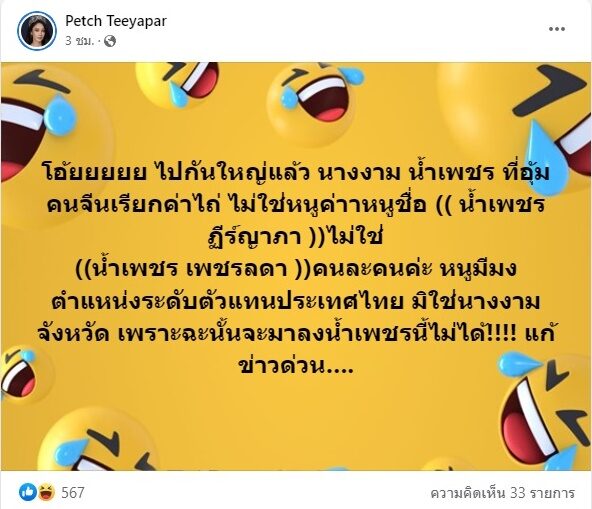 “โอ้ยยยยย ไปกันใหญ่แล้ว นางงาม น้ำเพชร ที่อุ้มคนจีนเรียกค่าไถ่ ไม่ใช่หนูค่าา หนูชื่อ ((น้ำเพชร ฏีร์ญาภา))” ไม่ใช่ ((น้ำเพชร เพชรลดา)) คนละคนค่ะ หนูมีมง ตำแหน่งระดับตัวแทนประเทศไทย มิใช่นางงามจังหวัด เพราะฉะนั้นจะมาลง น้ำเพชรนี้ไม่ได้!!!! แก้ข่าวด่วน….”