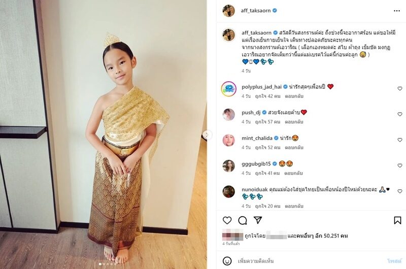 ควันหลงวันปีใหม่ไทยที่ผ่านมา คุณแม่ลูกหนึ่งคนสวย แอฟ ทักษอร เคลื่อนไหวผ่านอินสตาแกรมส่วนตัว โดยได้โพสต์รูปลูกสาว น้องปีใหม่ เอวาริณ เตชะณรงค์ กับชุดไทยในวันสงกรานต์น่ารักงดงามอย่างไทยมากๆ พร้อมแคปชั่นว่า