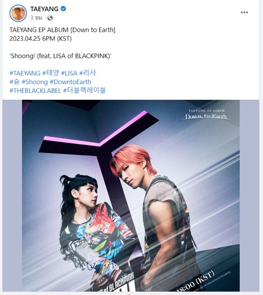 เรียกว่า เตรียมสร้างตำนานใหม่ให้กับวงการ K-Pop เมื่อต้นสังกัดของศิลปินหนุ่ม “แทยัง” หรือที่รู้จักในนาม แทยัง BigBang ได้ออกมายืนยัน “ลิซ่า BLACKPINK” จะร่วมคอลแล็บใน เพลง “Shoong” อัลบั้มชุดใหม่ ของแทยัง ซึ่งมีกำหนดปล่อยในเดือนเมษายนนี้