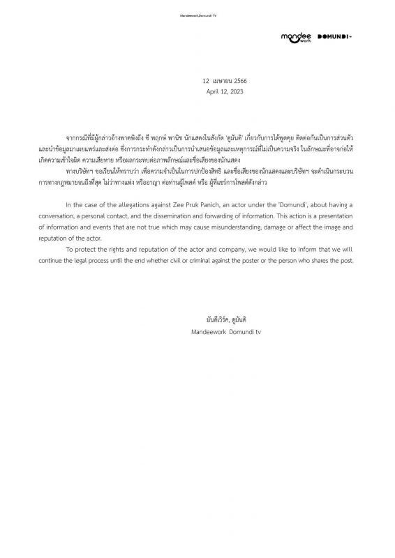 ซี “มีคุยกับทางค่าย แจ้งทางกฎหมายแล้วด้วย (หนักถึงขั้นไหน?) เราไม่รู้ลึกขนาดนั้น รู้มาบ้าง แค่เป็นตุเป็นตะ บางคนไหลตาม เชื่อเขา แต่ไม่ได้อยากให้ไหลตาม เชื่อเขาทุกคน เพราะมันเป็นเรื่องไม่จริง