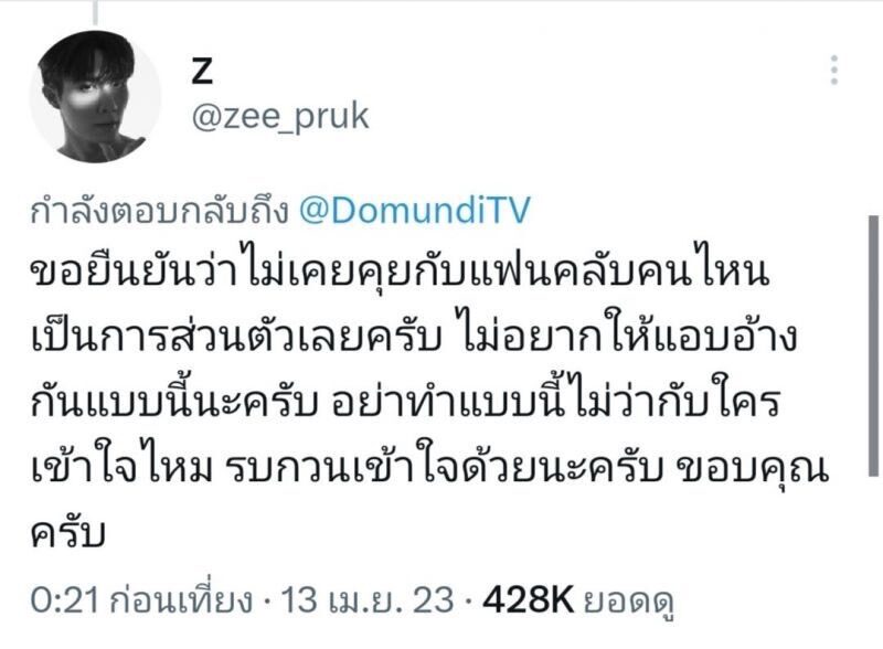 นอกจากนี้เจ้าตัวที่ได้โพสต์ในทวีตเตอร์ว่า “ไม่เคยคุยกับแฟนคลับคนไหนเป็นการส่วนตัวเลยครับ ไม่อยากให้แอบอ้างกันแบบนี้นะครับ อย่าทำแบบนี้ไม่ว่ากับใครเข้าใจไหม รบกวนเข้าใจด้วยนะครับขอบคุณครับ”