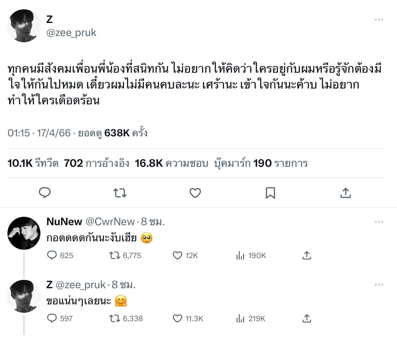 ซี “ไม่รู้ว่าไทม์ไลน์มันเมื่อไหร่ แต่มีข้อความที่ไหลตามก็เลยรู้สึกว่าอยากจะพูด ไม่อยากให้คนอื่นเข้าใจผิด (ห่วงแฟนคลับใช่ไหม?) ห่วงแฟนคลับ และห่วงตัวเองด้วย ไม่อยากให้ใครเข้าใจผิด แต่เขาก็มายอมรับไปแล้ว”