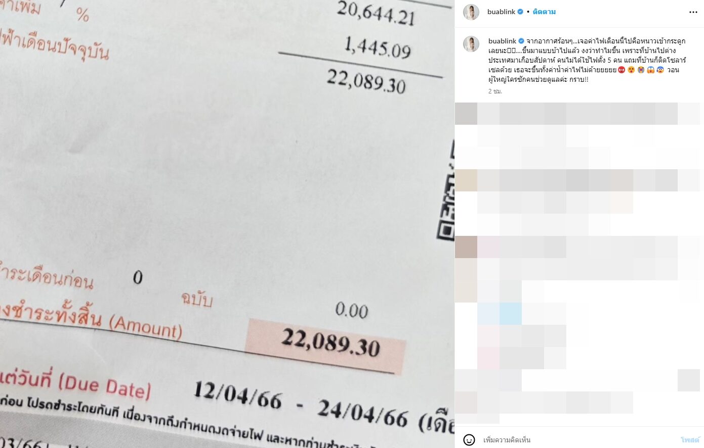 โดยบัว สโรชา โพสต์ภาพบิลค่าไฟฟ้าลงไอจีที่แพงถึง 22,089 บาท พร้อมข้อความว่า “จากอากาศร้อนๆ…เจอค่าไฟเดือนนี้ไปคือหนาวเข้ากระดูกเลยนะ….ขึ้นมาแบบบ้าไปแล้ว งงว่าทำไมขึ้น เพราะที่บ้านไปต่างประเทศมาเกือบสัปดาห์ คนไม่ได้ใช้ไฟตั้ง 5 คน แถมที่บ้านก็ติดโซลาร์เซลล์ด้วย เธอจะขึ้นทั้งค่าน้ำค่าไฟไม่ด้ายยยยย วอนผู้ใหญ่ใครซักคนช่วยดูแลค่ะ กราบ!!”