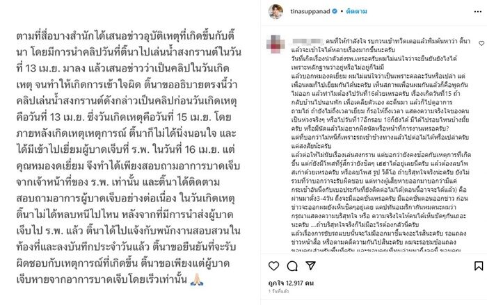 ด้านเพื่อนของผู้บาดเจ็บ ก็เข้ามาคอมเมนต์ในไอจีของ ติ๊นา ด้วยว่า “คนที่ให้กำลังใจ รบกวนเข้าทวิตเตอแล้วพิมค้นหาว่า ติ๊นา แล้วจะเข้าใจได้หลายเรื่องมากขึ้นนะครับ วันที่เกิดเรื่องนำตัวส่งรพ.เหรอครับผมไม่แน่ใจว่าจะยืนยันยังไงได้ เพราะหลักฐานว่าอยู่หรือไม่อยู่ก็ไม่มี