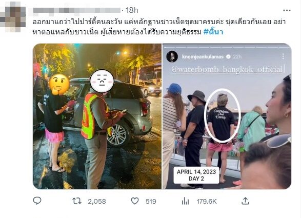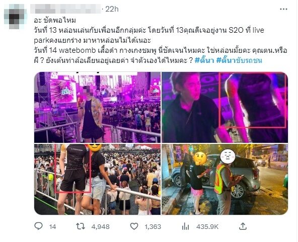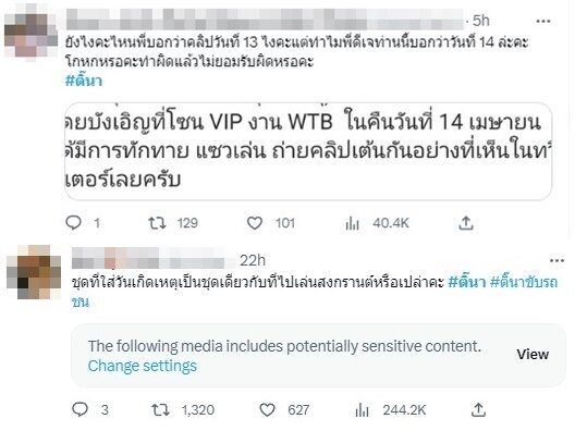ส่วนอีกทวีตก็ลงภาพ ติ๊นา ไปอีกงานวันที่ 13 เมษายน และไปอีกงานวันที่ 14 เมษายน ก่อนเกิดอุบัติเหตุ พร้อมข้อความว่า “อะ ชัดพอไหม วันที่ 13 หล่อนเล่นกับเพื่อนอีกกลุ่มค่ะ โดยวันที่ 13คุณดีเจอยู่งาน S2O ที่ live parkคงแยกร่าง มาหาหล่อนไม่ได้เนอะ วันที่ 14 watebomb เสื้อดำ กางเกงชมพู นี่ชัดเจนไหมคะ ใช่หล่อนมั้ยคะ คุณตน.หรือผี ? ยังเต้นท่าล้อเลียนอยู่เลยค่า จำตัวเองได้ไหมคะ ? #ติ๊นา #ติ๊นาขับรถชน”