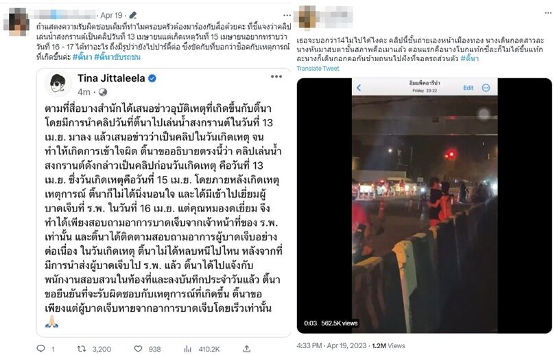 #ติ๊นา ยังพุ่งแรงในโลกทวิตเตอร์ วิพากษ์วิจารณ์อย่างต่อเนื่อง ดราม่าข้ามวันข้ามคืน กรณีนักแสดงสาวหล่อ ขับรถเก๋งชนหนุ่มขี่รถจักรยานยนต์อาการโคม่า เมื่อเวลา 03.53 น. วันที่ 15 เมษายน 2566 ย่านปากซอยอ่อนนุช 38 เขตสวนหลวง กทม.